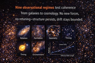 Nine observational regimes test coherence from galaxies to cosmology. No new forces, no retuning—structure persists, drift stays bounded.