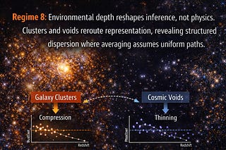 Regime 8: Environmental depth reshapes inference, not physics. Clusters and voids reroute representation, revealing structured dispersion where…