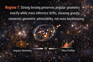 Regime 7 technical note: Strong lensing preserves angular geometry exactly while mass inference drifts, showing gravity conserves geometric…