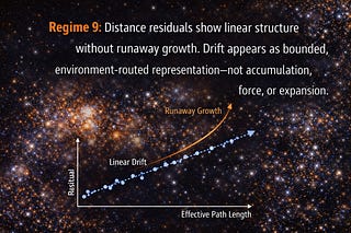 Regime 9: Distance residuals show linear structure without runaway growth. Drift appears as bounded, environment-routed representation—not accumulation…