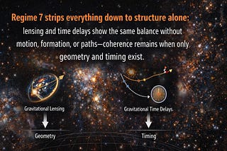 Regime 7 strips everything down to structure alone: lensing and time delays show the same balance without motion, formation, or paths—coherence remains…