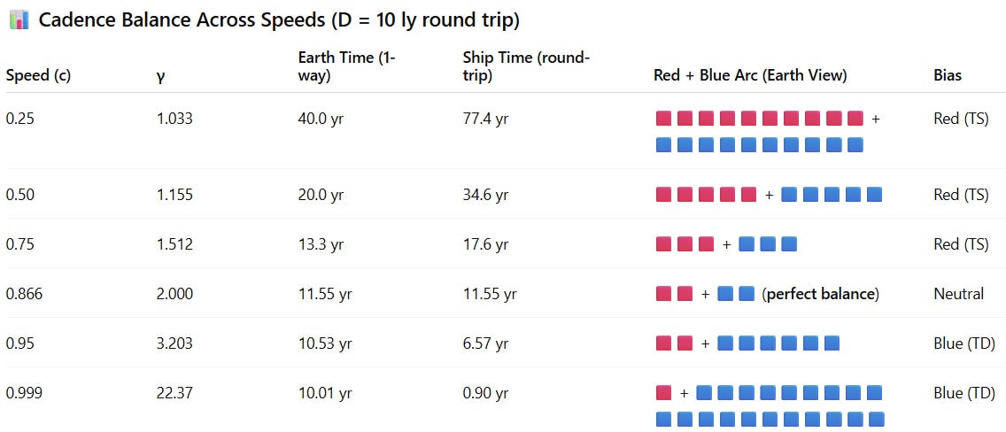 Previously, we found a curious point of balance. At a speed of about 0.866c, the redshifted outbound leg and the blueshifted return compressed into one perfect optical arc. The trip closed cleanly: stretch and compression matched, and the traveler’s round-trip time equaled Earth’s one-way time. But that balance didn’t hold at every speed. The moment we looked away from 0.866c — slower or faster — the symmetry began to tilt.